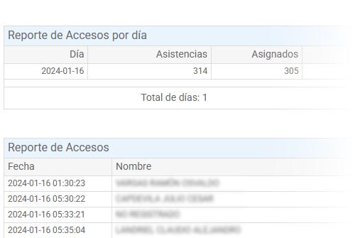 El Reporte de Accesos permite ver y descargar los accesos por día acorde a la fecha seleccionada. En él se despliega el total de accesos diarios, así como el total de Asistencias y el total de Asignados. Pulsando en el botón Reporte de Accesos se accede a ello.