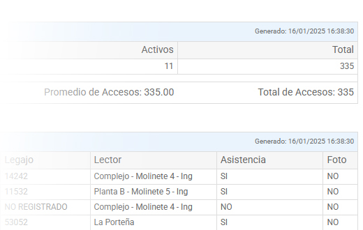 También se despliega, junto a los Accesos por Día, una tabla con el Reporte de Accesos filtrado por Nombre, Legajo, Lector, Tarjeta y el Estado de la Asignación.