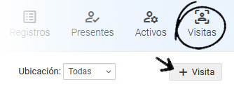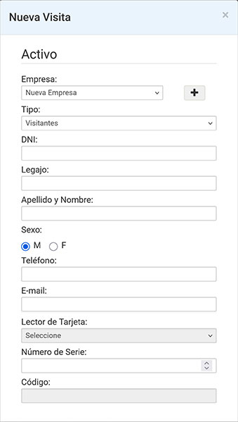 El botón +Visita muestra el formulario para registrar una nueva visita, permitiendo ingresar los datos de la persona o vehÃculo a registrar. Puede ver con más detalle el Alta de Visitas para VehÃculos